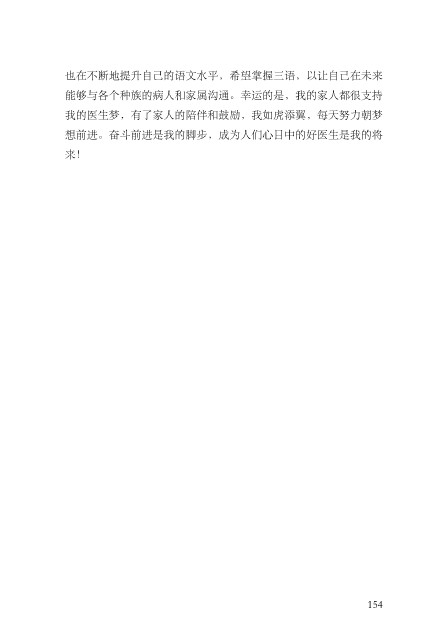 也在不断地提升⾃⼰的语⽂⽔平,希望掌握三语,以让⾃⼰在未来 能够与各个种族的病⼈和家属沟通。幸运的是,我的家⼈都很⽀持 我的医⽣梦,有了家⼈的陪伴和⿎励,我如虎添翼,每天努⼒朝梦 想前进。奋⽃前进是我的脚步,成为⼈们⼼⽬中的好医⽣是我的将 来! 154