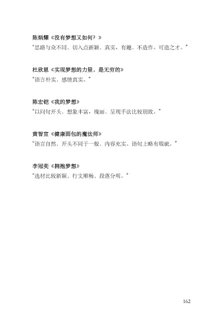 陈炳耀《没有梦想又如何?》 “思路与众不同,切⼊点新颖,真实、有趣,不造作。可造之才。” 杜欣恩《实现梦想的⼒量,是⽆穷的》 “语⾔朴实,感情真实。” 陈宏铠《我的梦想》 “以问句开头,想象丰富、瑰丽,呈现⼿法⽐较别致。” 黄智宣《健康⾯包的魔法师》 “语⾔⾃然,开头不同于⼀般,内容充实。语句上略有瑕疵。” 李冠奕《拥抱梦想》 “选材⽐较新颖,⾏⽂顺畅,段落分明。” 162