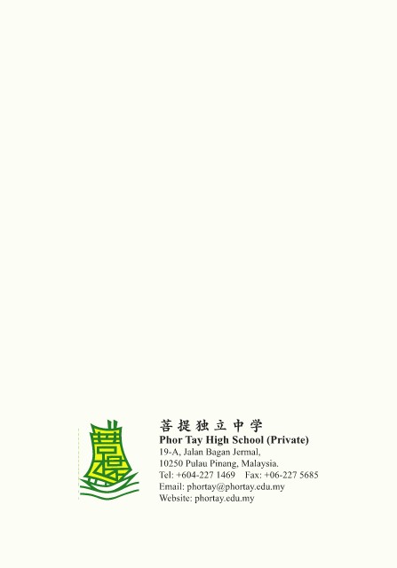 菩 提 独 立 中 学 Phor Tay High School (Private) 19-A, Jalan Bagan Jermal, 10250 Pulau Pinang, Malaysia. Tel: +604-227 1469 Fax: +06-227 5685 Email: phortay@phortay.edu.my Website: phortay.edu.my