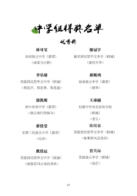 菩提国民型华⽂中学(槟城) 培南独⽴中学(霹雳)