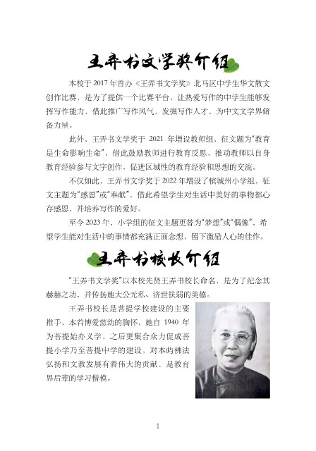 本校于 2017 年⾸办《王弄书⽂学奖》北马区中学⽣华⽂散⽂